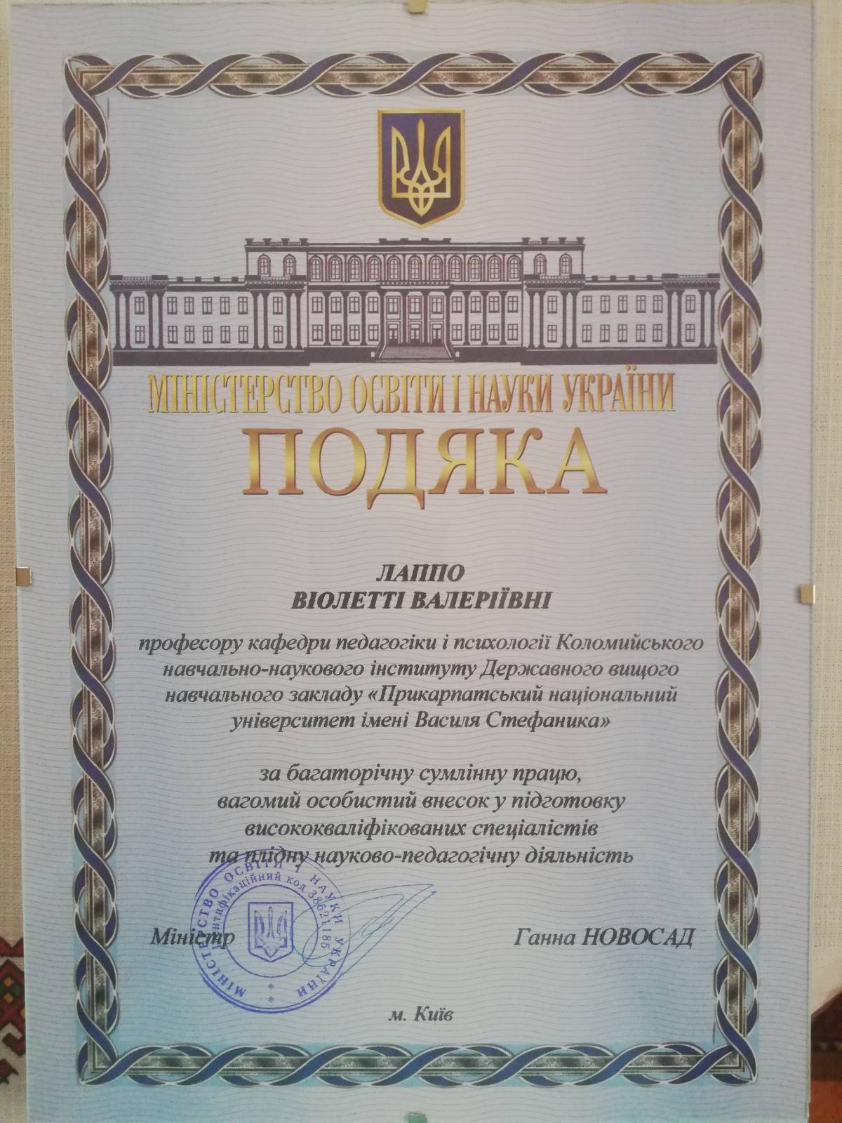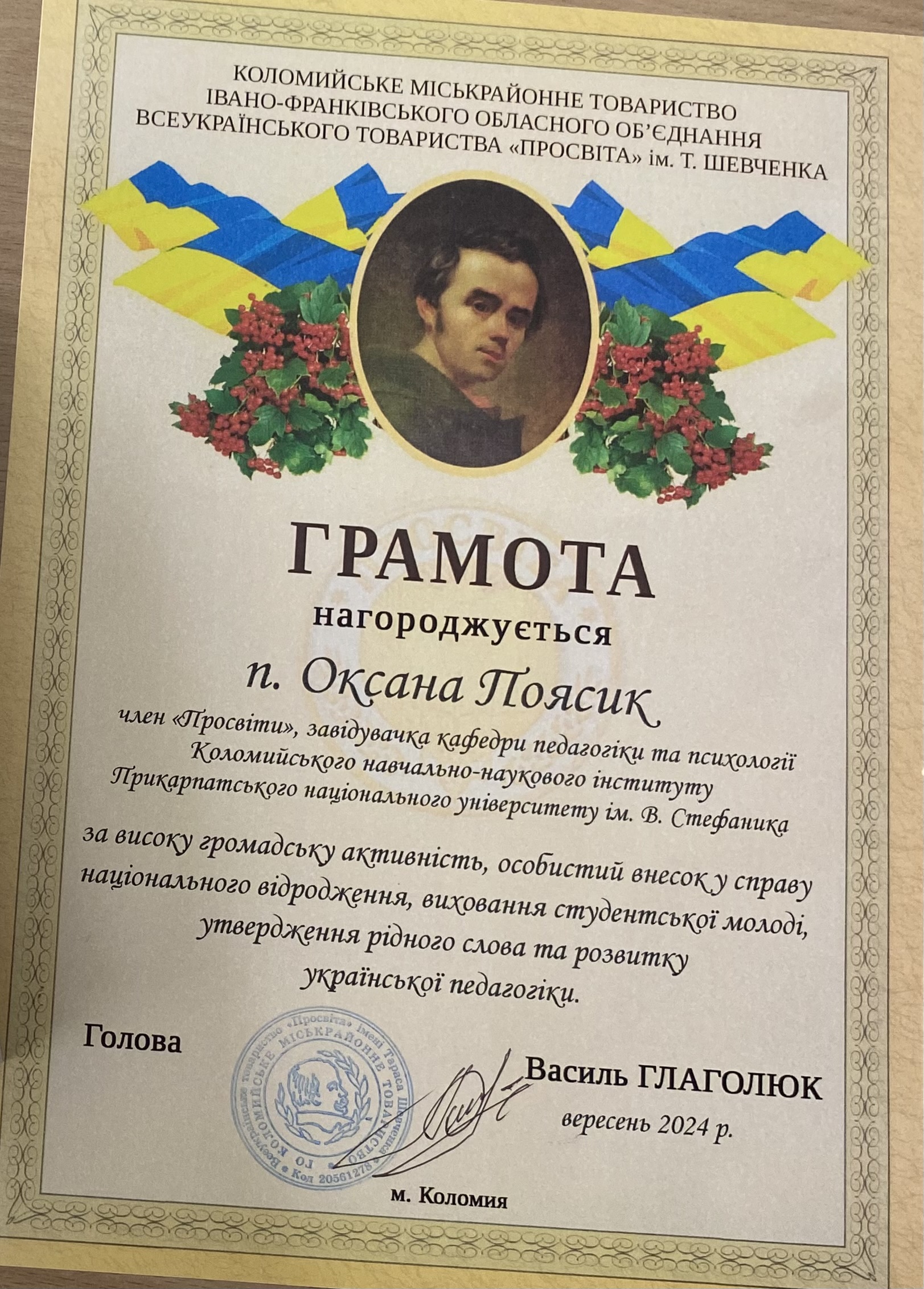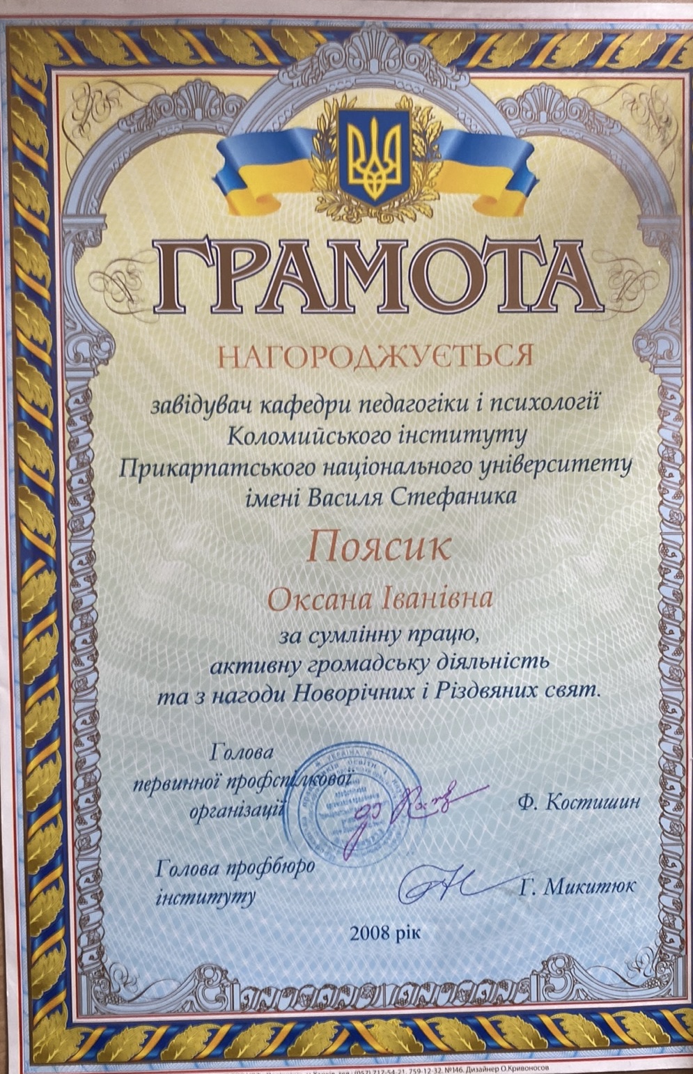Грамота Коломийського міського голови, 2008 р. Грамота, ректорат і профспілковий комітет Прикарпатського національного університету, 2010 р. Грамота Івано-Франківської обласної державної адміністрації 2011 р. Подяка, управління освіти Коломийської міської ради, 2013 р. Грамота, управління освіти Коломийської міської ради, 2014 р. Диплом за участь у Всеукраїнській науково-практичній конференції «Василь Стефаник, Іван Франко, Андрей Шептицький у контексті культурно-історичних процесів кінця XIX-початку XX ст.», 2019 р. Подяка за сприяння в організації та проведенні Всеукраїнської науково-практичної «Василь Стефаник, Іван Франко, Андрей Шептицький у контексті культурно-історичних процесів кінця XIX-початку XX ст.», 2019 р. Подяка, Фенікс-Коломия Подяка ППО працівників Прикарпатського національного університету імені Василя Стефаника, 2017 р. Подяка, творча навчально-наукова лабораторія Міжнародного проєкту «Гірська школа Українських карпат» Прикарпатського національного університету імені Василя Стефаника, 2024 р. Подяка Коломийського міського голови, 2024 р. Подяка, міністерство освіти і науки України