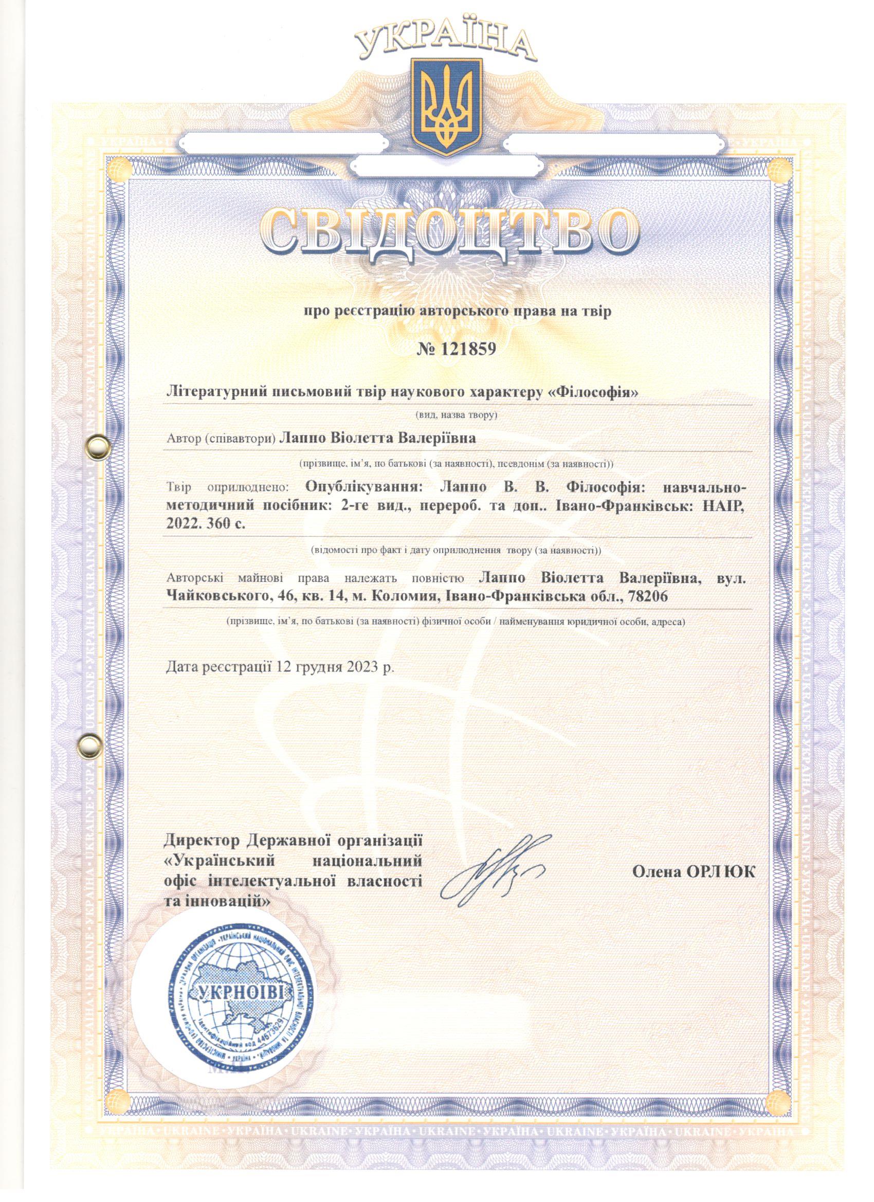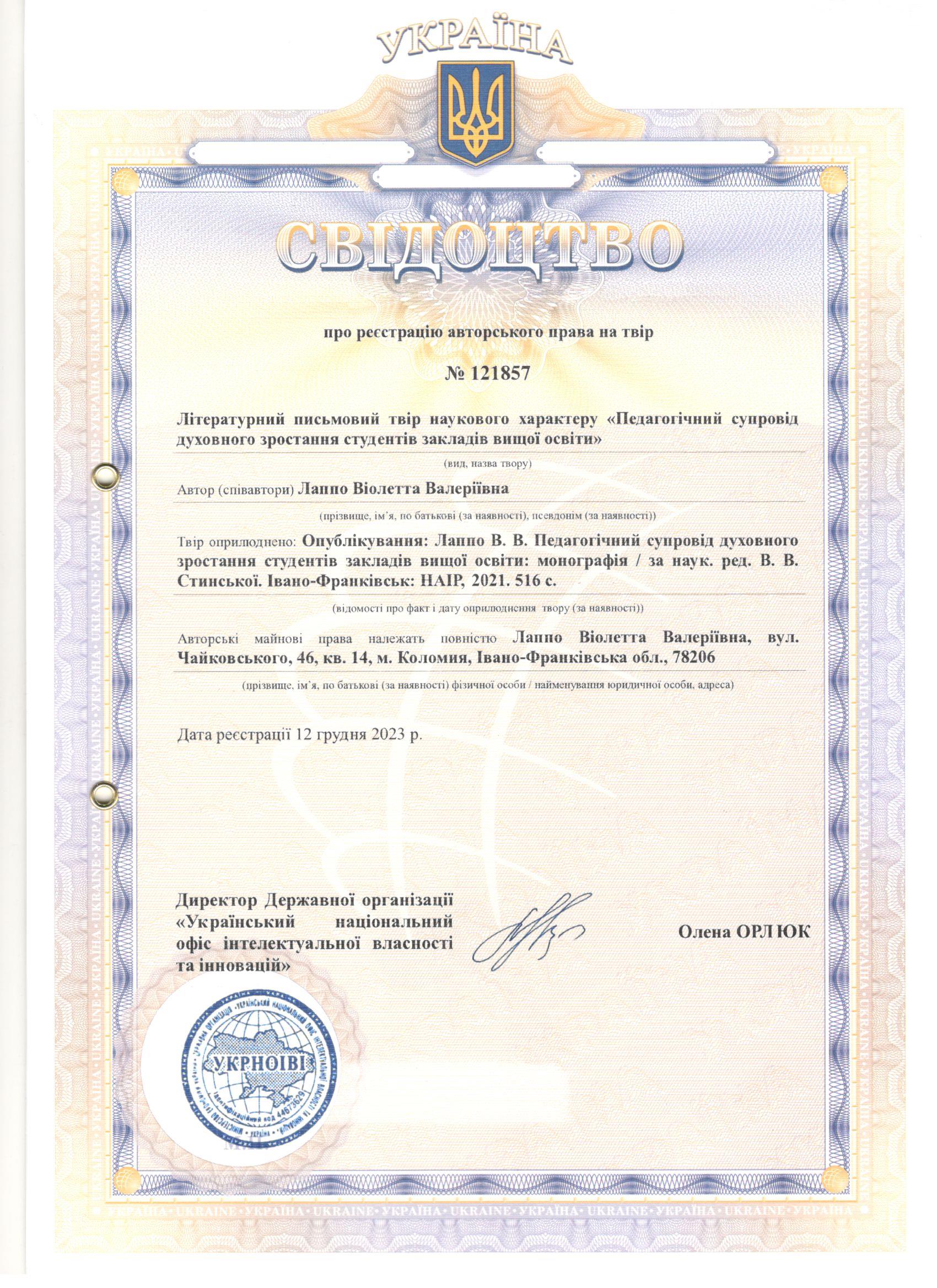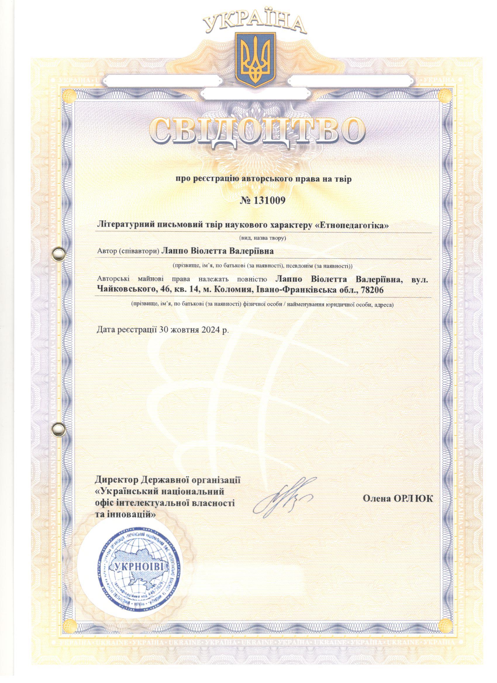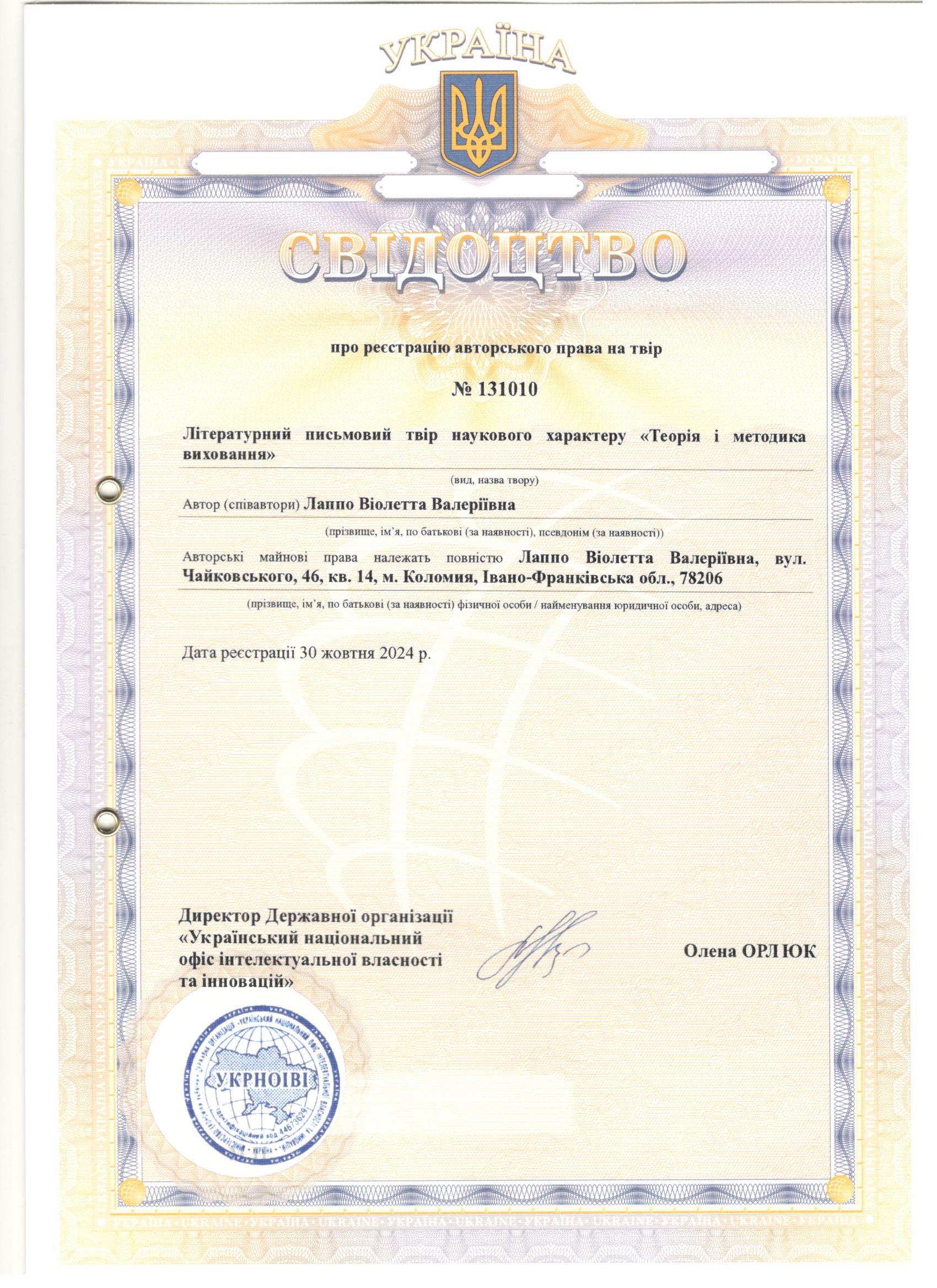 Свідоцтво про реєстрацію авторських прав на твір № 104766, 2021 р. Свідоцтво про реєстрацію авторських прав на твір № 104676, 2021 р Свідоцтво про реєстрацію авторських прав на твір № 121857, 2023 р. Свідоцтво про реєстрацію авторських прав на твір № 121859, 2023 р Свідоцтво про реєстрацію авторських прав на твір № 131009, 2024 р. Подяка Коломийського міського голови 2024 р. Свідоцтво про реєстрацію авторських прав на твір № 131010, 2024 р Подяка міністерства освіти і науки України, 2021 р. Подяка міністерства освіти і науки України