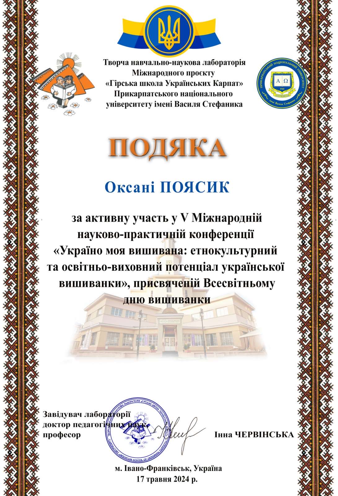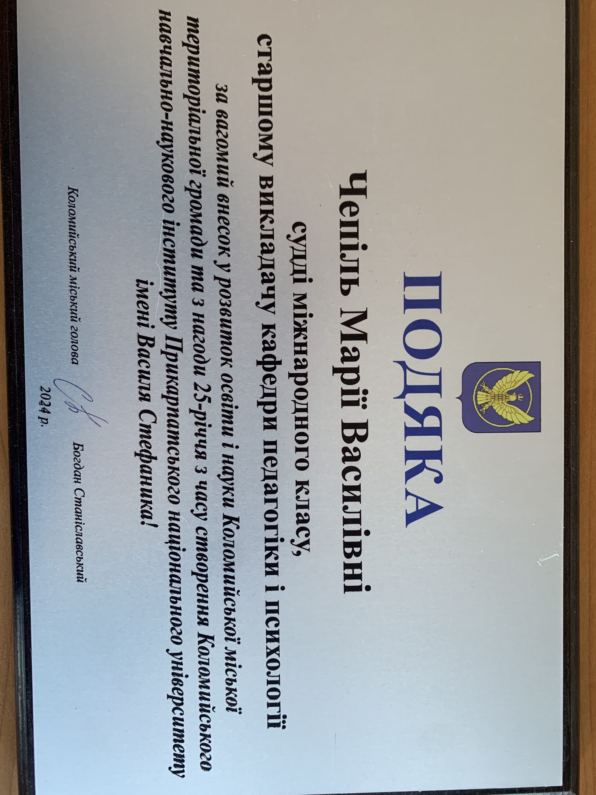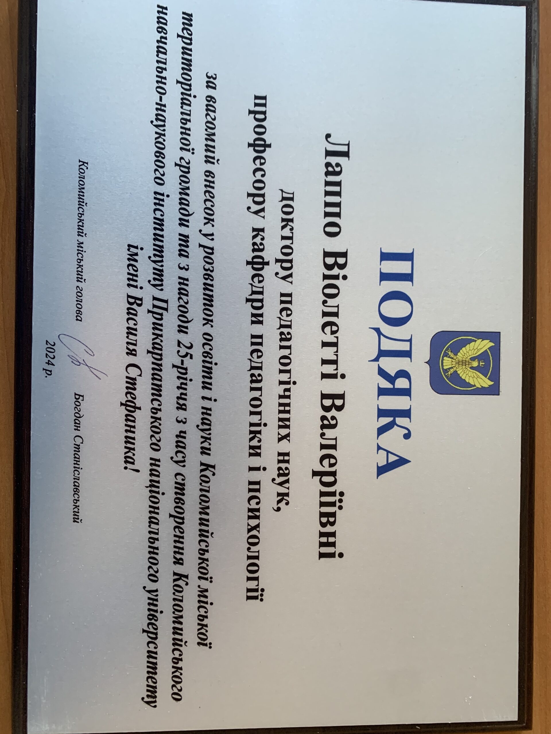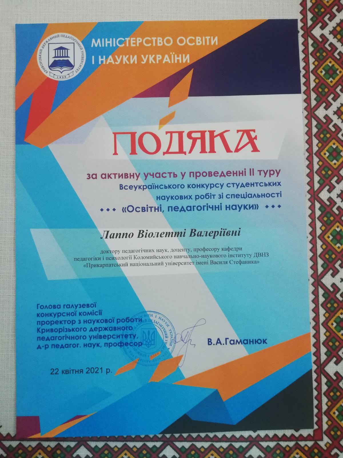 Свідоцтво про реєстрацію авторських прав на твір № 104766, 2021 р. Свідоцтво про реєстрацію авторських прав на твір № 104676, 2021 р Свідоцтво про реєстрацію авторських прав на твір № 121857, 2023 р. Свідоцтво про реєстрацію авторських прав на твір № 121859, 2023 р Свідоцтво про реєстрацію авторських прав на твір № 131009, 2024 р. Подяка Коломийського міського голови 2024 р. Свідоцтво про реєстрацію авторських прав на твір № 131010, 2024 р Подяка міністерства освіти і науки України, 2021 р. Подяка міністерства освіти і науки України