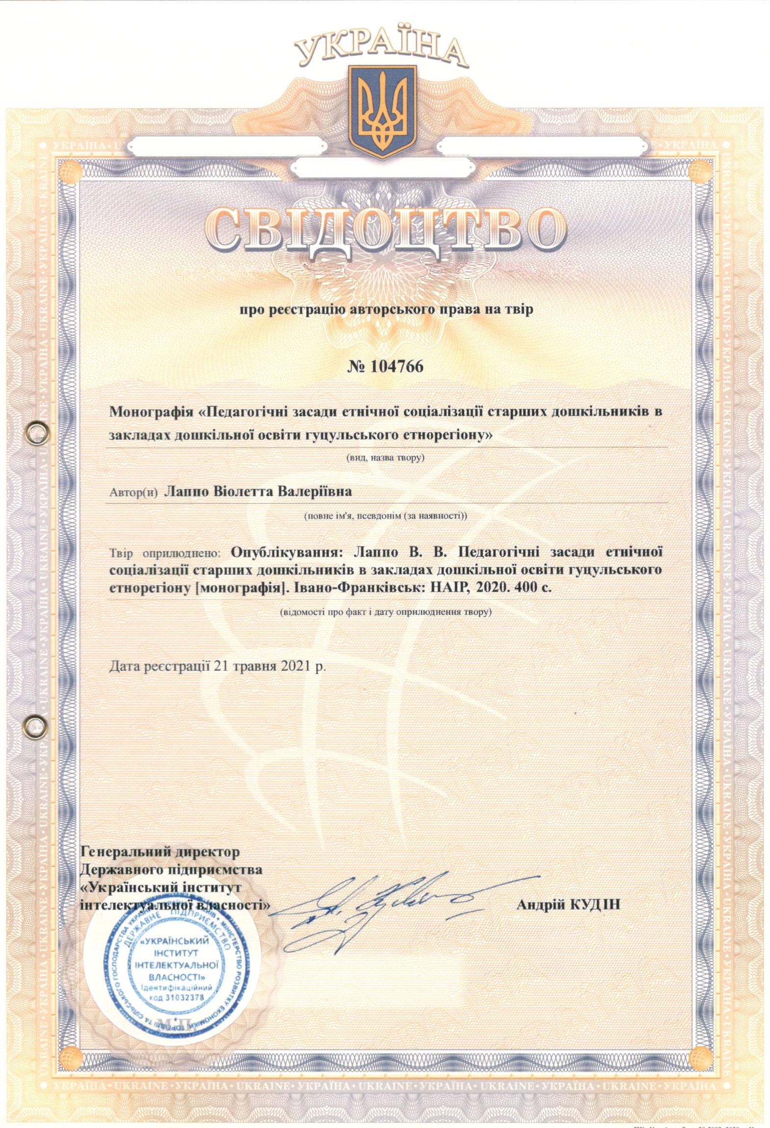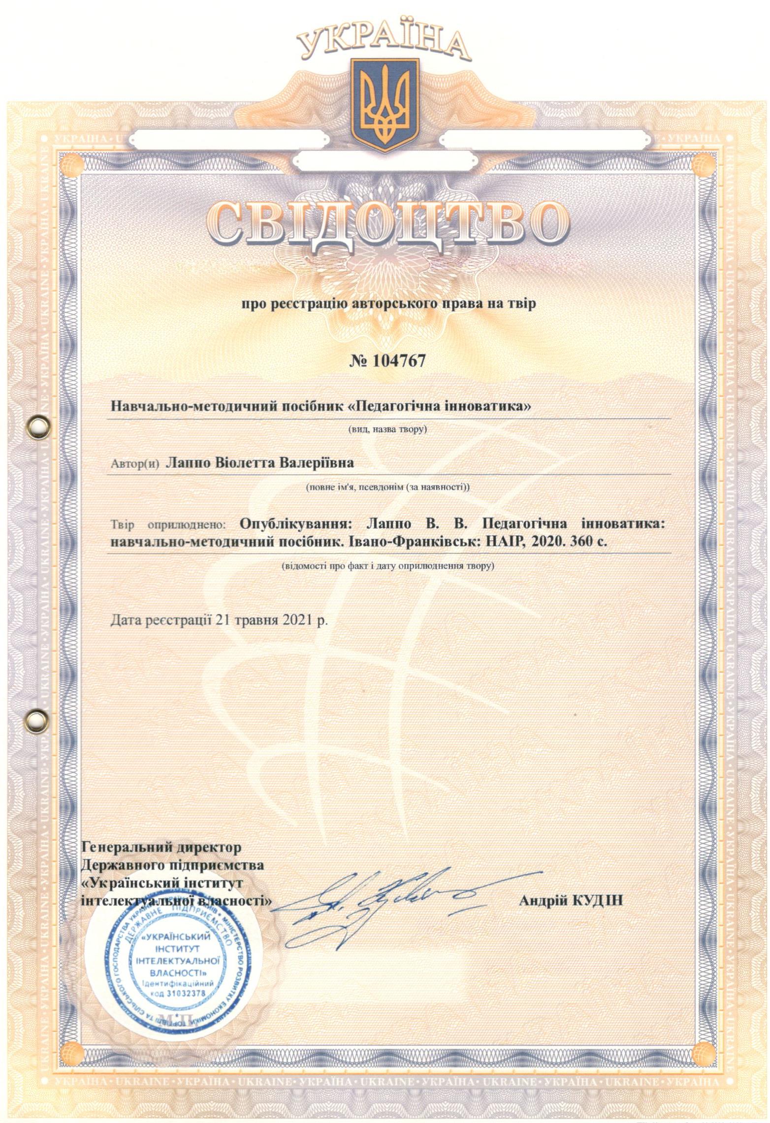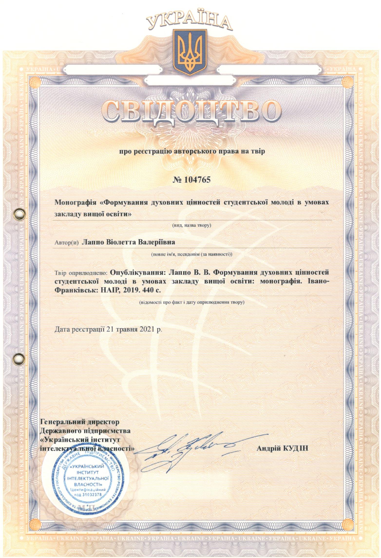 Свідоцтво про реєстрацію авторських прав на твір № 104765, 2021 р.