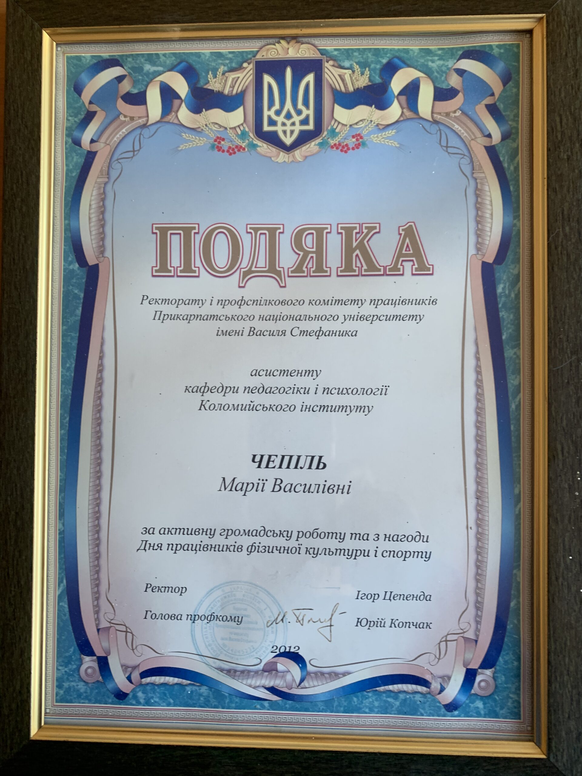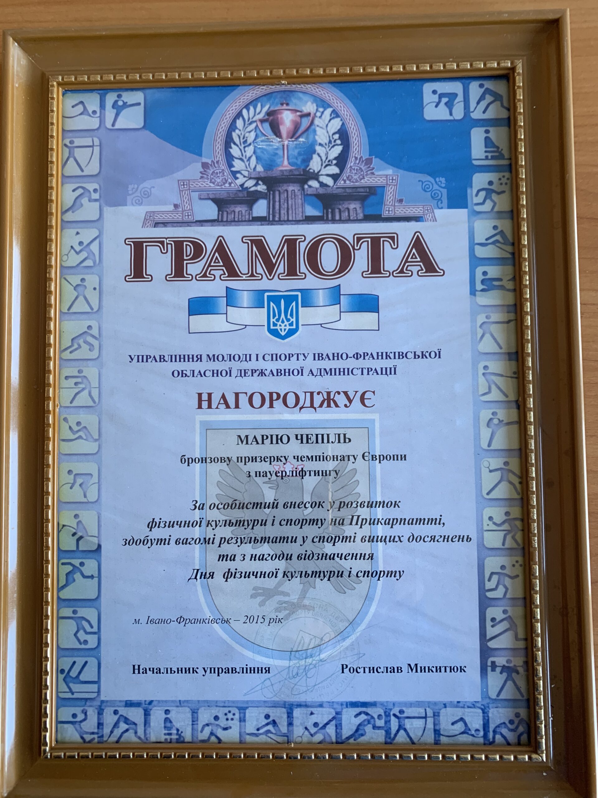 Почесна грамота, міністерство освіти і науки України, комітет з фізичного виховання та спорту, 2015 р. Грамота управління молоді і спорту Івано-Франківської обласної державної адміністрації 2015 р. Диплом, міністерство молоді та спорту, федерація пауерліфтингу України, 2021 р. Грамота, міністерство молоді та спорту, федерація пауерліфтингу України, 2022 р. Відзнака «Кращий суддя 2022 року» Диплом, міністерство молоді та спорту, федерація пауерліфтингу України, 2023 р. Диплом, міністерство молоді та спорту, федерація пауерліфтингу України, 2023 р Подяка Колосмийського міського голови 2024 р. Диплом, міністерство молоді та спорту, федерація пауерліфтингу України, 2024 р. Диплом, міністерство молоді та спорту, федерація пауерліфтингу України, 2024 р Подячна грамота, музей Бутинар, 2024 р. Відзнака «Кращий суддя 2024 року» Грамота, Прикарпатський національний університет імені Василя Стефаника, 2025 р. Диплом, міністерство молоді та спорту, федерація пауерліфтингу України, 2025 р Диплом, міністерство молоді та спорту, федерація пауерліфтингу України, 2025 р. Диплом, міністерство молоді та спорту, федерація пауерліфтингу України, 2025 р.